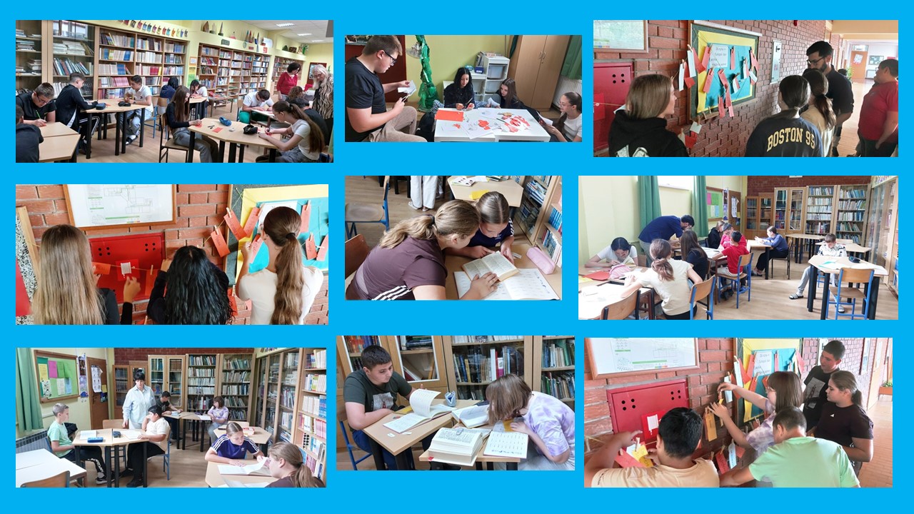 U ponedjeljak 22.rujna 2025., učenici 8. a razreda posjetili su s razrednicom školsku knjižnicu. Tijekom sata razrednika obilježili su nadolazeći Europski dan jezika koji se obilježava 26.rujna. Za obilježavanje Europskog dana jezika odabrali smo pojmove povezane s knjižnicom jer je ovogodišnji Mjesec hrvatske knjige posvećen knjižničarima. U aktivnost su se uključili učenici 7.razreda s učiteljem engleskog jezika 24.rujna, a potom i učenici 6.razreda s učiteljicom njemačkog jezika 26.rujna. U knjižnici su tražili riječi u rječnicima stranih riječi. Učenici su ponovili, ali i usvojili knjižnične pojmove koje su potom zapisivali na papirićima. Papiriće su prikvačili na uže koje će, uz pano s natpisom, biti trajni poticaj i podsjetnik, svim učenicima na sudjelovanje u ovogodišnjem knjižničnom projektu Uberi riječi – što nam rječnik može reći?